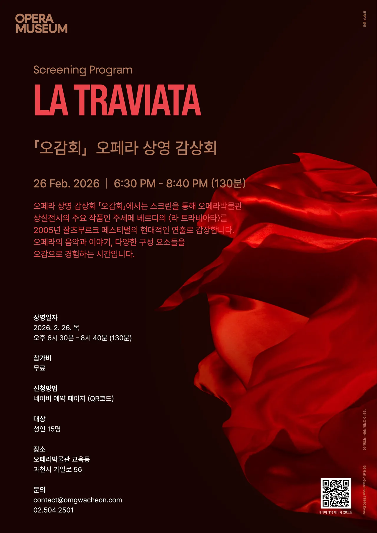 오페라 상영 감상회 「오감회」에서는 스크린을 통해 오페라박물관 상설전시의 주요 작품인 주세페 베르디의 <라 트라비아타>를 2005년 잘츠부르크 페스티벌의 현대적 연출로 감상합니다. 음악과 이야기, 다양한 요소들을 오감으로 경험하는 시간입니다.